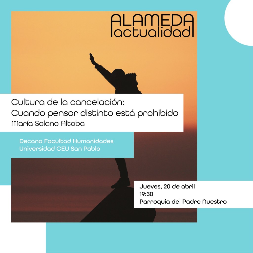 Seguimos con el ciclo de conferencias Alameda actualidad. Este Jueves 20 de abril a las 19:30 horas en los locales de la parroquia, con el tema Cultura de la cancelación: cuando pensar distinto está prohibido, por María Solano Altaba, decana de la facultad de humanidades de la Universidad CEU San Pablo.
