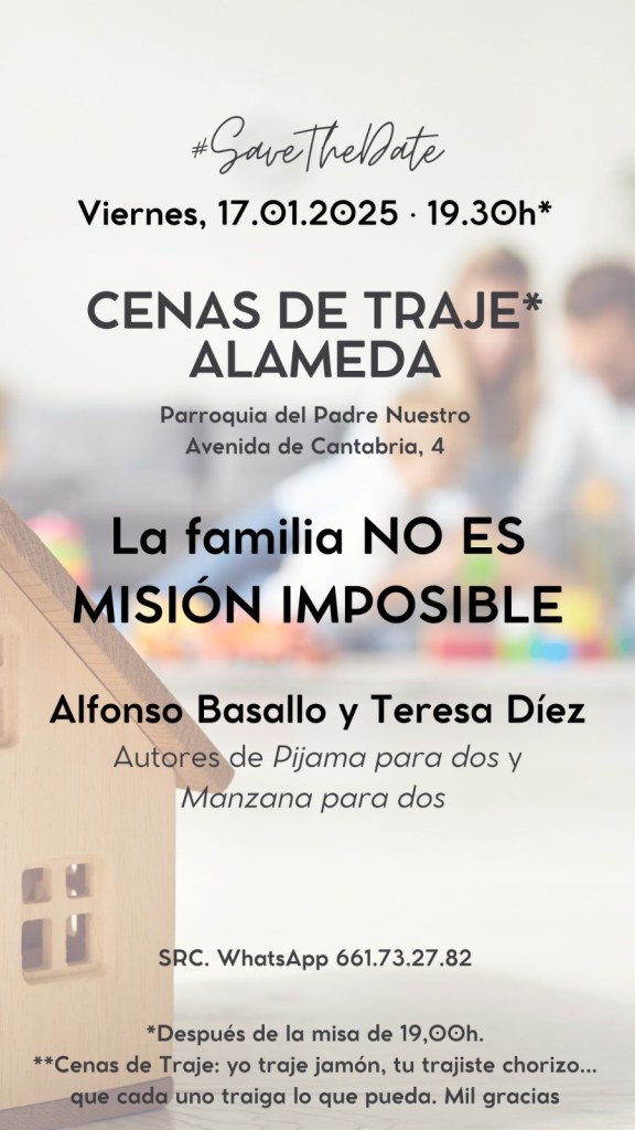 El próximo Viernes, 17 de Enero a las 19:30, celebraremos una cena de traje (yo traje tortilla, yo traje patatuelas, yo traje limonada, etc) en la cual Alfonso Basallo y Teresa Díez nos hablarán sobre como «La familia NO ES IMPOSIBLE».
