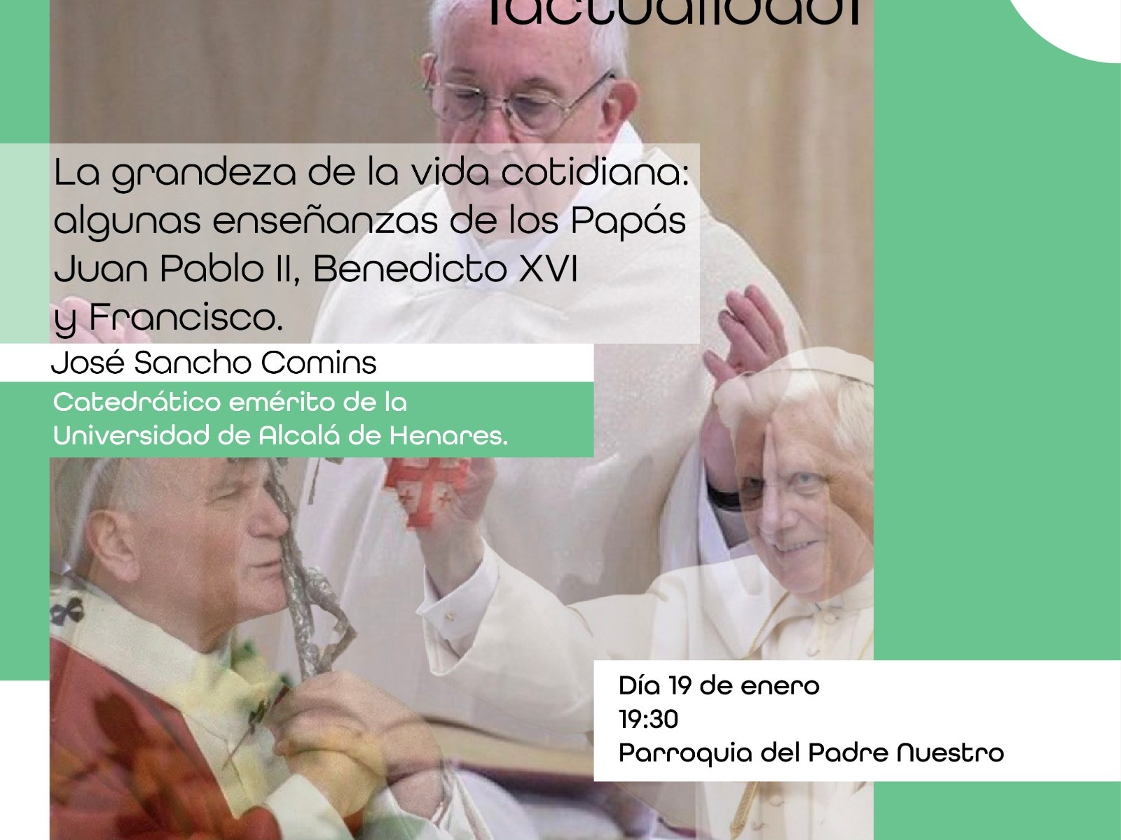 Continuamos con el ciclo de conferencias Alameda actualidad. Este Jueves 19 de enero a las 19:30 horas en los locales de la parroquia, con el tema La grandeza de la vida cotidiana: algunas enseñanzas de los Papas: Juan Pablo II, Benedicto XVI y Francisco, por José Sancho Comins, Catedrático emérito de la Universidad de Alcalá de Henares.
