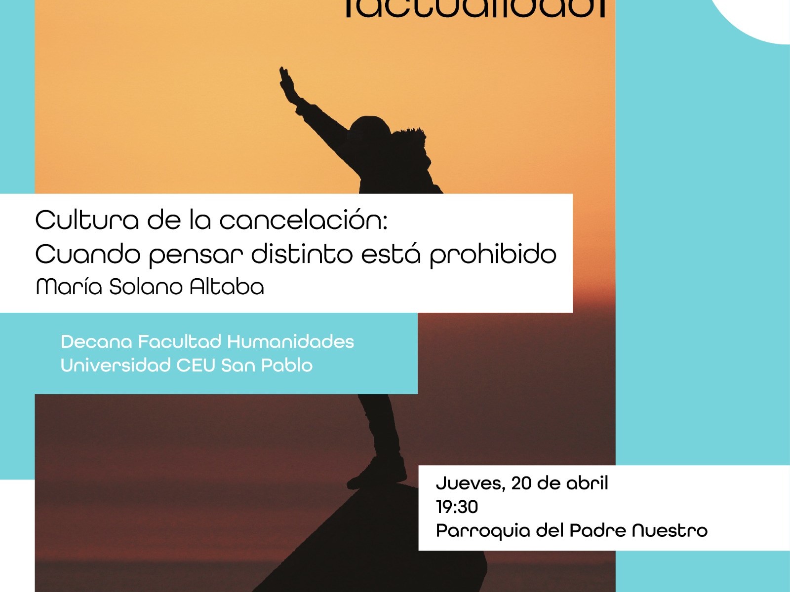 Seguimos con el ciclo de conferencias Alameda actualidad. Este Jueves 20 de abril a las 19:30 horas en los locales de la parroquia, con el tema Cultura de la cancelación: cuando pensar distinto está prohibido, por María Solano Altaba, decana de la facultad de humanidades de la Universidad CEU San Pablo.